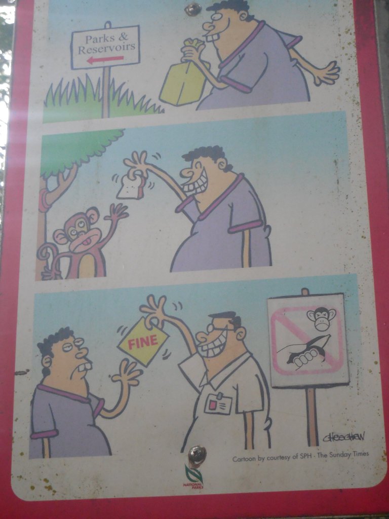 After some nail-biting moments in rush hour traffic, our driver dropped us safely at Bukit Timah Nature Reserve. The hope was that we might see some more monkeys, but in the wild this time. Although it was still drizzling, the reserve was packed with locals walking and jogging. We started with a short hike to a quarry, where we enjoyed some nice views, but saw no monkeys (other than the ones on the sign reminding hikers not to feed the monkeys). Then we did a longer hike on one of the trails – longer being a relative term, because we didn’t get too far between the heat and our difficulty reading the trail maps.