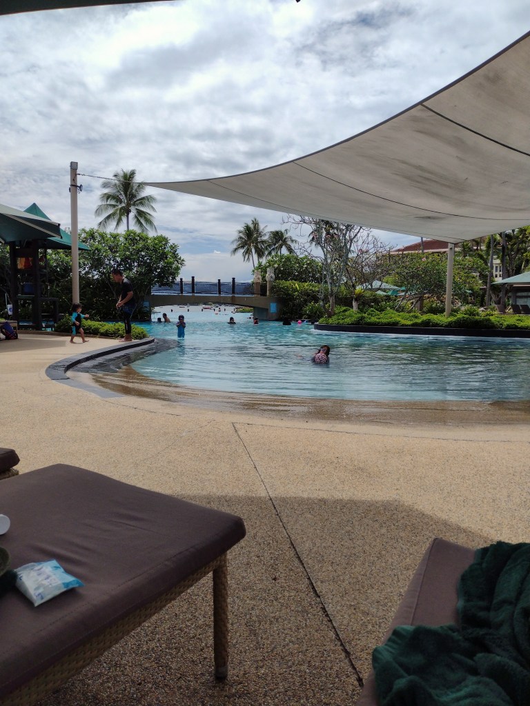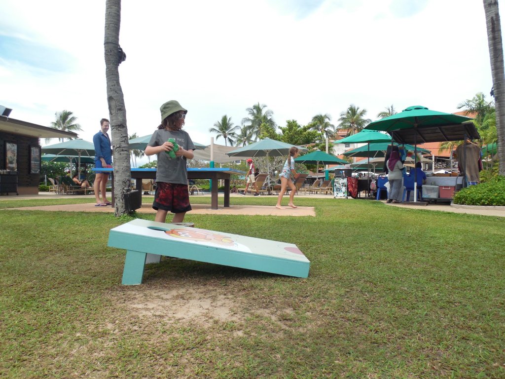 While I had been desperately trying to fix my camera, P had been swimming on his own. His patience for that was beginning to run out. We decided to head to lunch. As we were drying off, D returned from his massage. We headed to Coco Joes, the outdoor bar and grill, as a group. Coco Joes has mainly Western style food. P ordered pizza, D ordered shrimp, and I had the veggie burger. My burger was very enjoyable; it was topped with beet relish, jalapenos, and a creamy dressing, making for a nice combination of sweet, spicy and creamy flavors. Service was also excellent.