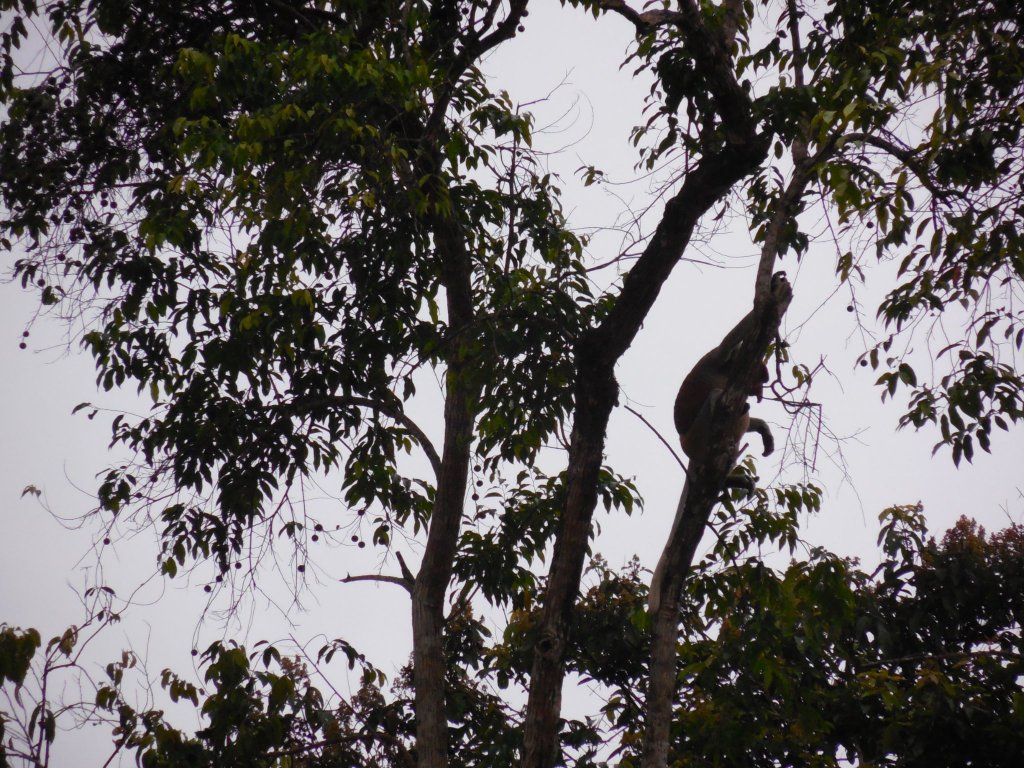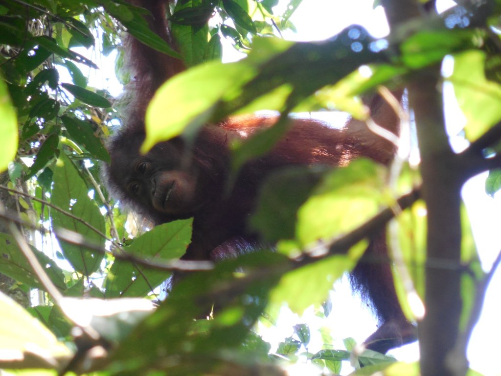 After lunch, there was supposed to be a talk about orangutans, but our guide had not given us details as to the time and location, so we missed it. Instead, we visited the gift shop to spend some of the credit to our account and relaxed in our room. Our relaxation was interrupted by a knock at one point; it was one of the guides letting us know that an orangutan was near the boardwalk trail. We hurried over and had the opportunity to watch the young juvenile eating and swinging through the trees. We were all delighted, but none more so than P, who said: “Seeing one orangutan in the wild is worth seeing a thousand in captivity.” As we watched the ape, the guide explained that you can tell when there is an orang in a tree versus a monkey because monkeys shake the trees with their jumps, while orangs cause the trees to sway as they swing. This would come in handy later. He also shared my favorite orang fact. If you are watching orangs early in the morning, they are likely to be female; the males often sleep until late morning or even early afternoon, while the females are up first thing in the morning.