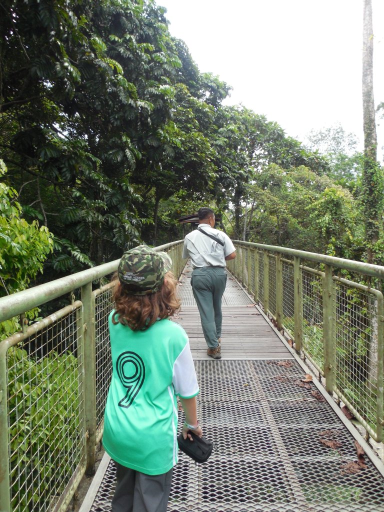 In Sandakan, we docked at the now familiar boat club and, after a comfort stop at the restrooms, we piled into a bus for one last tour in Borneo. Our plan for the day was to visit the Rainforest Discovery Centre and Sandakan Memorial Park before our 6:30 pm flight to Kuala Lumpur. If there is any silver lining to having to put off our trip for two years, it is that we were able to partake in these activities. In 2020, P was a first grader and we were wary of keeping him up past his bedtime, so we booked an early flight to KL. By 2022, P was routinely staying up later than D and I, so the later flight seemed more doable.