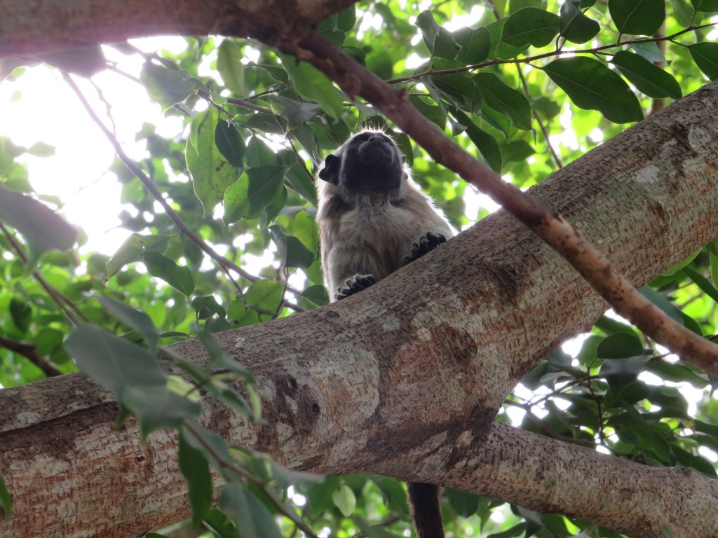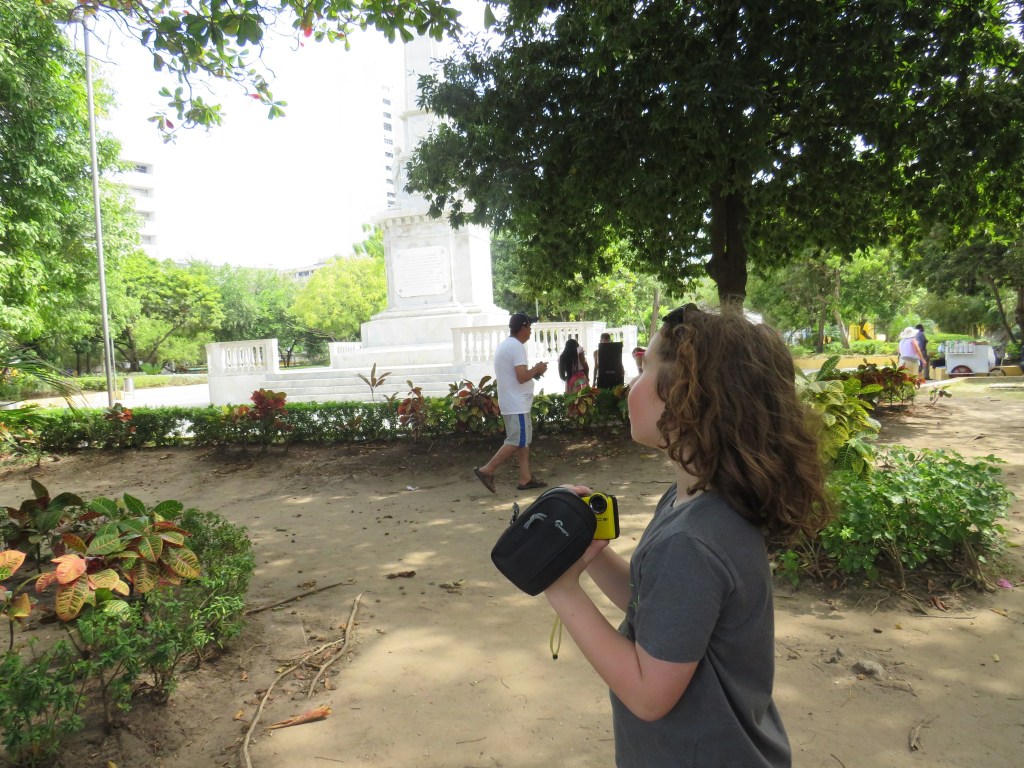 Parque del Centenario is a small park just outside the city walls. It was at the top of our Cartagena agenda because it has the one thing P most appreciates about a destination: monkeys. My understanding is that the monkeys who live in the park were rescued from the illegal pet trade and released into the park. They are a mixed family of cotton top and white handed tamarins who live a semi-wild lifestyle in the city. They are free to roam, but it seems like they are fed to encourage them to stay in the park. I inferred the bit about feeding based upon the big pile of fruit on the ground in the center of the park.
