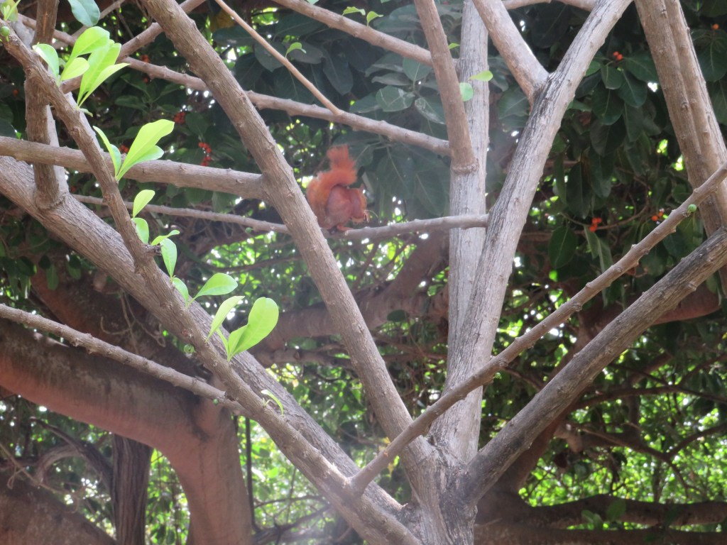 Even though the park is not large, spotting a few tiny monkeys still posed a challenge. Fortunately, a park employee who saw us scanning the trees approached us. “Sloth?” he asked. “Sloth. Si! Sloth!” we replied. The park worker led us to a tree containing a three-toed sloth. We took some photos. “Mono?” he then proposed. Finding the monos required climbing up onto the landscaped areas of the park, something that the park employee assured us was okay. He then pointed out a tree that contained an entire family of monkeys. P happily watched and photographed the monkeys for quite a while. I don’t know what the proper etiquette is in this situation, but D did tip the park employee; he had made our son’s day, after all.