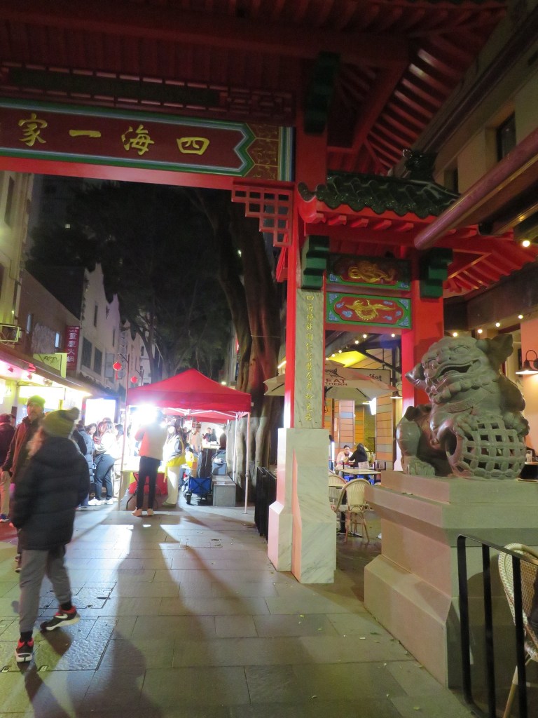 Back at the hotel, it was time for a long rest. Our dinner plans for the evening were to visit the Chinatown Night market. The market is held on Friday nights and features several blocks worth of food stalls and trinkets. It is a short trolley ride from the Intercontintal to Chinatown. The trolley was busy with folks heading out for their Friday evening plans, but we squeezed our way on. Once we reached our stop, we procured some cash from a nearby ATM, and then walked through the Chinatown Ceremonial Gates to experience the market.