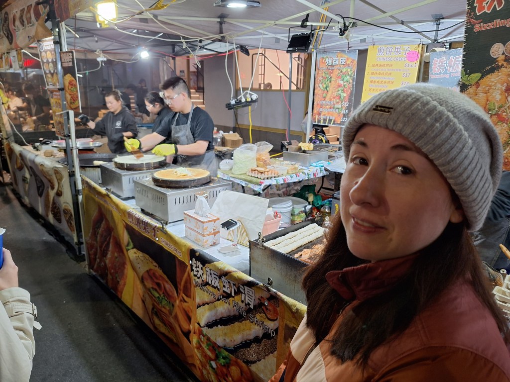 There were plenty of people out enjoying the market, which created a lively and enjoyable atmosphere. After milling around a bit, we made our first food selection: an assortment of vegetarian skewers from a barbeque stall. They had tofu, mushroom, and gluten. Then, realizing that our produce intake for the day had been limited, we shared some fruit. Finally, we wrapped up our dinner with Jian Bing, a Chinese savory crepe. Ours was stuffed with egg, crispy noodles, cabbage, and a savory sauce. This was our first time trying Jian Bing, and we all enjoyed it.