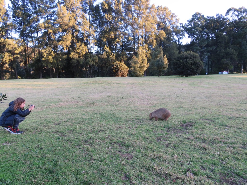 Then, we drove a bit further to our parking place for our time at Bendeela. Near our parking spot, we saw our first wombat. Dave quickly diagnosed the poor guy with mange and put in a call to whomever de-manges the area wombats. Apparently, there is a solution that can be poured on the animals to kill the parasites causing hair loss. Unlike kangaroos, wombats don’t appear to be at all skittish, so I would imagine it isn’t too much of a challenge to get their meds applied.