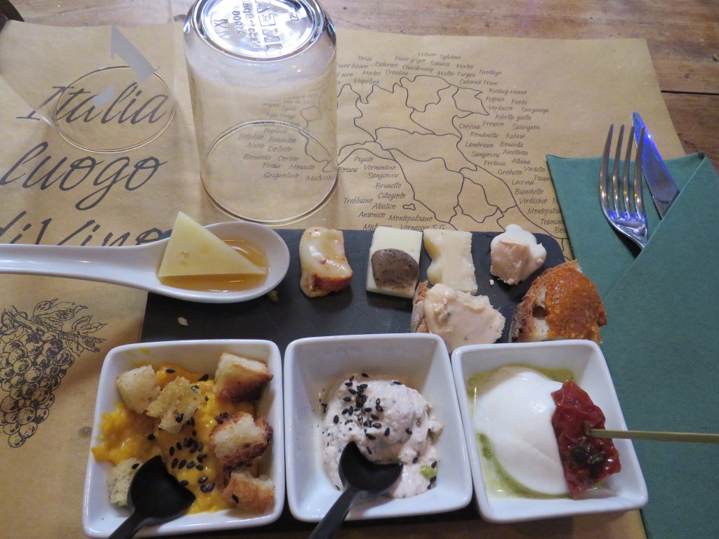 I chose La Salumeria for two reasons: it was close to our hotel and it had a selection of vegetarian sandwiches beyond the Caprese available almost everywhere. After reviewing the list of a dozen vegetarian sandwiches, D selected . . . the Caprese. I went with a cheese, pear, and greens sandwich. P had a cheeseboard. As it was now after 12 pm, D also ordered a carafe of the house white wine. (This began a trend that was almost certainly ill-advised given the heat). I am sure that randomly selecting a restaurant using Google Maps has its risks, but we were very pleased with this gamble. Our meal was tasty and inexpensive.