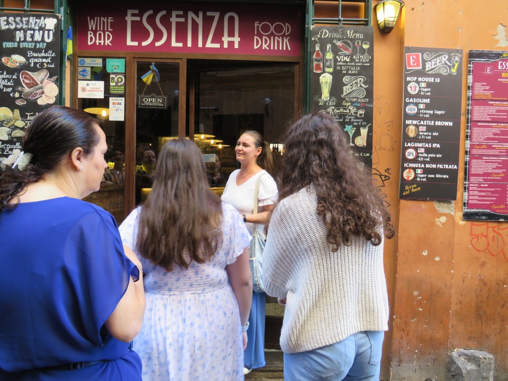 Although it was nearly 90 degrees, the walk was bearable because it was mostly shaded. We arrived in Piazza Trilussa with a solid 10 minutes to spare before the start of our evening with The Roman Food Tour. D and P took advantage of the extra time to souvenir shop while I waited at the designated meeting place. Within minutes, our guide, Alina, found me and we chatted until D and P returned and the rest of the tour group assembled. In a continuation of the “small world” theme from earlier in the day, most of the other families on the tour were from New England. One family even ran a dental practice less than 2 miles from our house. The group was a lot of fun and my usual social awkwardness quickly evaporated as the tour began.