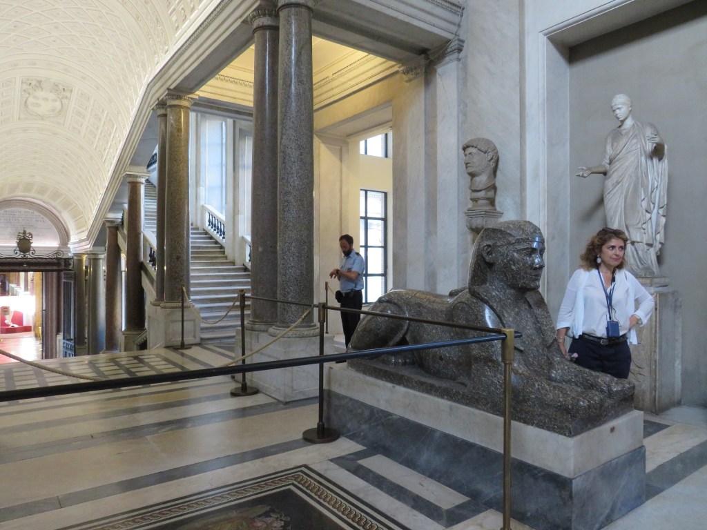 When we arrived at the Vatican Museums, we assembled outside the museum gates where we were assigned to either the Pinocchio or Geppetto group and met our local guides. (At many of the attractions we visited, we were split into two smaller groups due to group size restrictions. I think this may be a relic of Covid, but it was a positive one. The smaller group sizes made it easier to maneuver in crowded locations). We were then briefed on how to clear security and made our way into the building. There was an opportunity to use the restrooms before we joined our guide, Christina, who led us into the museums.