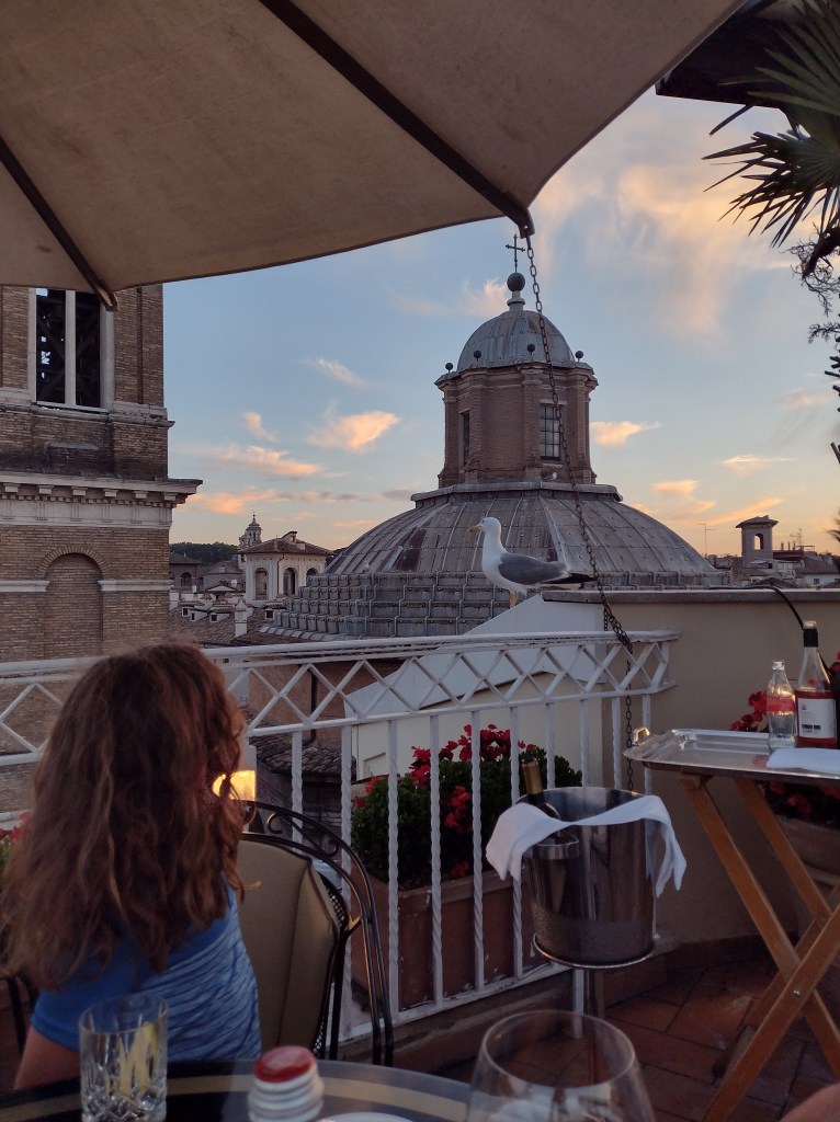 Our meal was special in every way. Special occasion, beautiful views, wonderful food and wine, and our special dining companion, a random seagull. We started with fried artichokes for D and I and a cheese-stuffed focaccia for P. Then D and I each had a pasta course and a main. D went with eggplant, and I decided to order an asparagus dish because it was something unique. Finally, we each ordered dessert: tiramisu for P, zabaglione for D and a crepe and ice cream dish for me. By the time we finished our meal, the sun had fully set, and we were looking out over the twinkling lights of Rome.