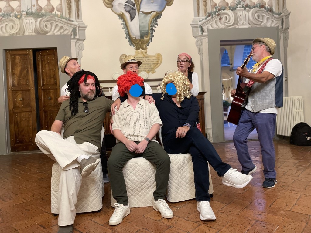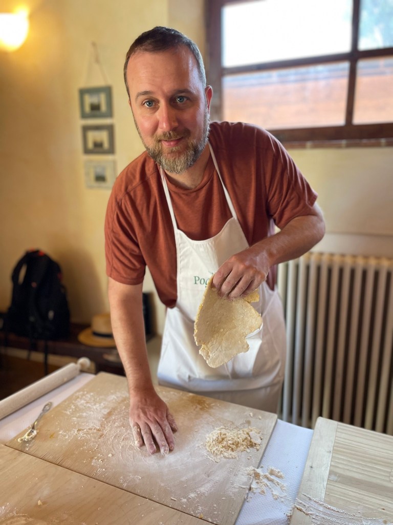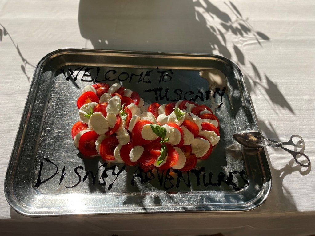 After another two-hour bus journey, we pulled up to Hotel Borgo Di Cortefreda in the Tuscan town of Tavarnelle Val di Pesa. We were welcomed to the hotel with an outdoor reception. As we mostly didn’t eat prosecco, fruit, and caprese salad (everyone was pretty set on food by this point), our guides passed out our room keys and the hotel cat made the rounds. One of our fellow guests later told us that the same cat had presented them with a mouse later in the day, so the human staff weren’t the only ones providing a warm welcome.