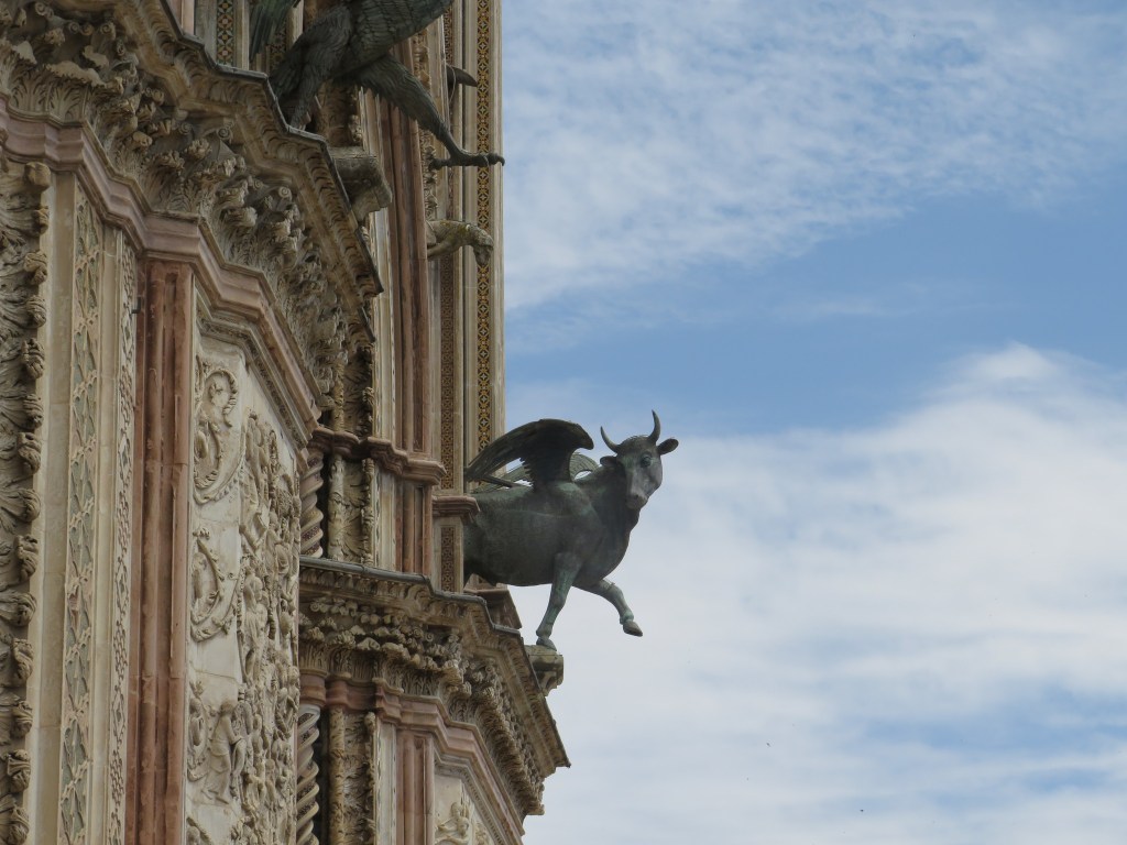 This was a leisurely and enjoyable meal. We sampled different cheeses and vinegars, some appetizers, a main, dessert, and – of course – wine. After lunch, we had time to explore the town. As you might expect, our first order of business was to find some gelato. Although I am not sure how I managed to eat it, I thought my ricotta and marmalade cone was the best of the trip. After gelato, we spent some time in the duomo. The duomo was built in medieval times and updated over the intervening centuries. Its most important feature remains the flying cows on its façade.