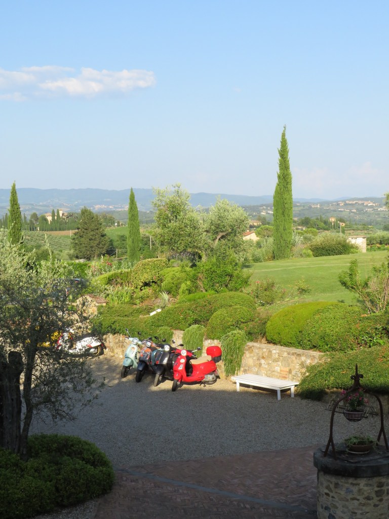 Once we had our keys, we headed to our room. It was straight out of central casting for a Tuscan hotel room, from the views of rolling hills to the colorful vespas parked below our window. P was excited to find that he had his own private loft and immediately made himself at home by decoratively scattering his socks around. Before too long, our luggage arrived, and we changed into our swimming gear for a visit to the pool. Like our room, the pool was ideally situated with views of the Tuscan countryside on 3 sides. (The pool is quite small given the size of the hotel, though, so actually swimming is something of an issue).