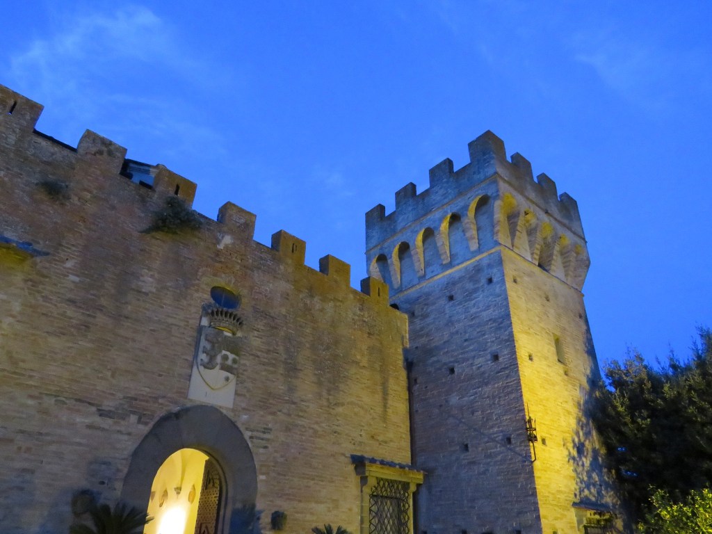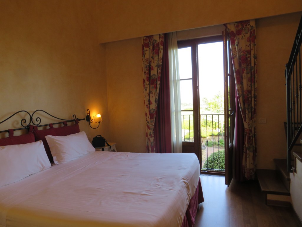 Soon, it was time to get cleaned up for dinner. This evening’s meal was one I had been looking forward to: a soda tasting and kids’ dinner for P and an adult dinner and wine tasting for D and me. ABD does an adult meal with separate activities for the kids on most of its trips and it had been a highlight of the Scotland trip for me. The dinner in Italy did not quite live up to the high standards set by the Scotland trip. Food-wise, it was my least favorite meal of the trip. (We had pasta and a rather bland stuffed artichoke; the main dish for meat eaters was platters of meat with a side of more meat). After dinner, D and I took a short walk around the hotel grounds, then headed downstairs to pick P up. P reported that the “lawn games” listed on the itinerary did not happen. However, he did have a soda tasting, dinner, and a movie night. Although the lobby bar was still open, we elected to head to our room to relax. I don’t know if it was the heat or the 3rd wine-tasting of the day, but I was asleep as soon as my head hit the pillow.