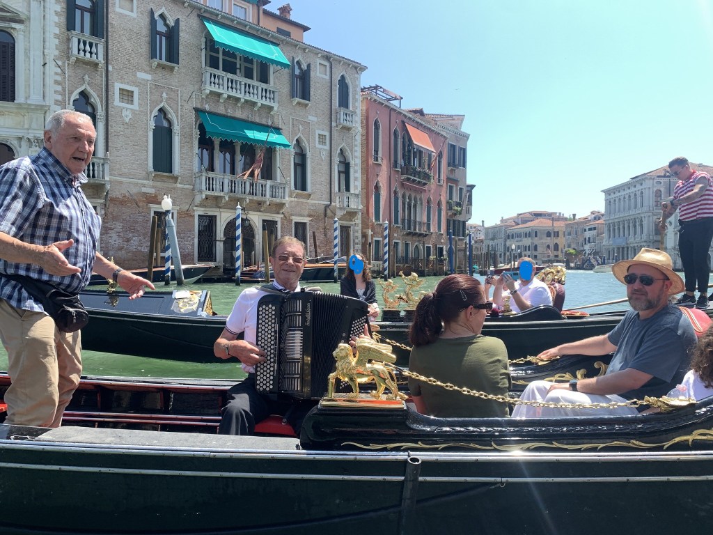 We posed for photos and then took a short walk to the boarding spot for our gondola ride. As others in our group were boarding their boats, Gabby asked if we would be okay with some extra people in our gondola. Having read other reports about this trip, I had a strong suspicion about who the extra people would be and offered an enthusiastic yes. Shortly after we stepped into our gondola, my hunch was confirmed. We were joined by two Italian men, one of whom was carrying an accordion.