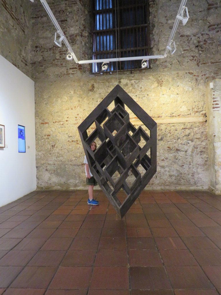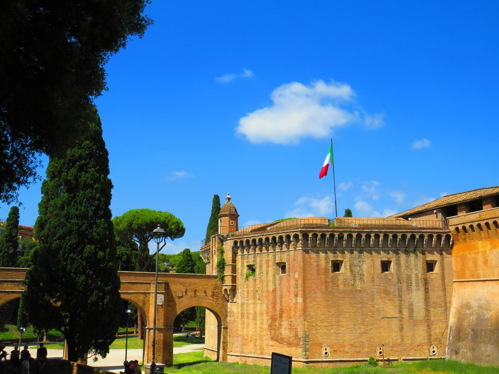 We were soon inside the building, which is an interesting mix of old and new. The building has had many uses over the years, from mausoleum, to Pope’s palace, to defensive structure. These are all explained on signs. In its current incarnation as tourist attraction, the building also hosts some modern art displays, a shirtless man in pantaloons prancing around a fountain, and a café with wonderful views of the city. After wandering around for a bit, we had some lemon sodas at the café while we looked out over the rooftops of Rome.