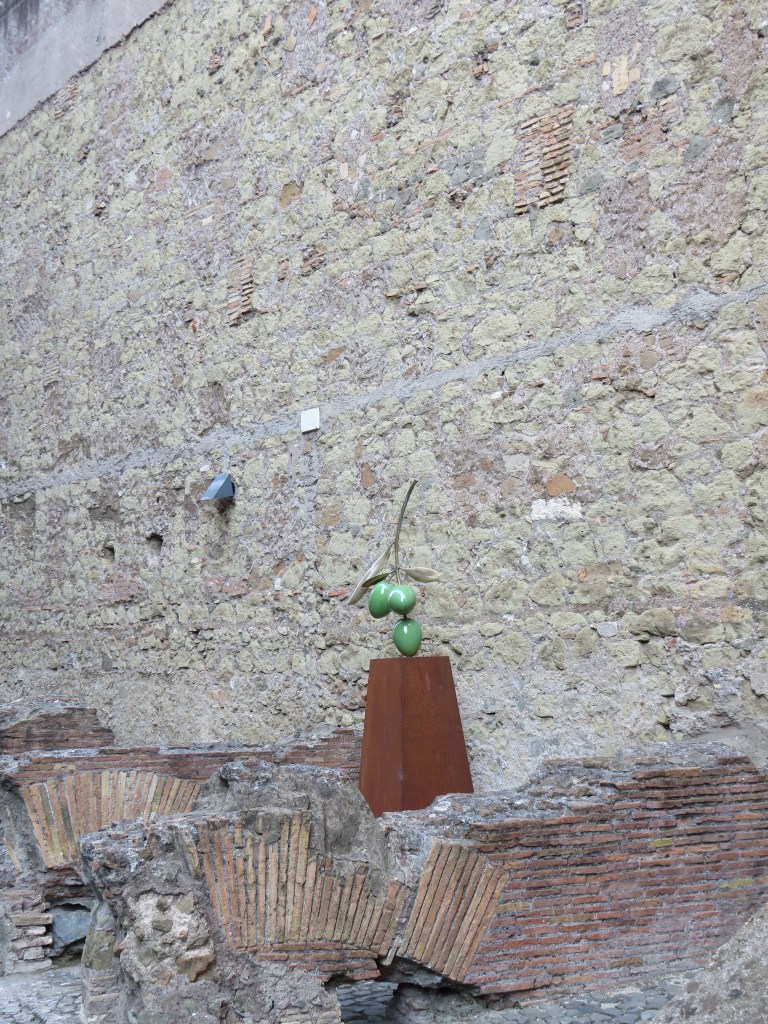After our snack break, it was time for dinner. I used the Taxi Now app to call a cab to take us to Pizzarium Bonci, a restaurant known for Roman style pizza. Roman style pizza is rectangular in shape with a thick, crispy crust. It is sold by weight. Bonci is so popular that you need to take a number upon arrival and wait for your turn to order at the counter. When our number was called, we went in and ordered the first pizza that looked vegetarian. In hindsight, we should have taken a deep breath and looked at all of the options before ordering. But, fortunately, our eggplant and tomato/cheese selections were tasty. We enjoyed them standing outside the restaurant, where there were a few counters for leaning.